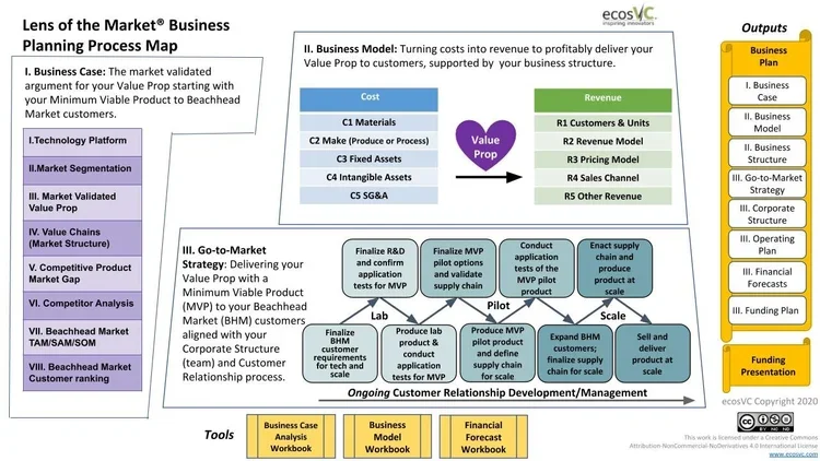 A go-to-market plan with a customer relationship model to deliver your product to the beachhead market from lab to pilot to scale;